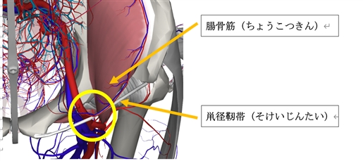 もう少し上から見てみましょう。足に行く血管が、骨盤(寛骨)に張り付いている腸骨筋と、骨盤から恥骨に繋がっている鼡径靭帯にはさまれています。